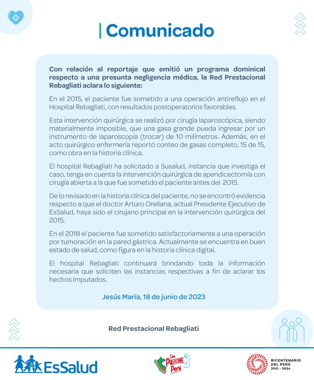 Por otro lado, SuSalud ha sancionado al Hospital Rebagliati en octubre del 2022 con una multa de 1 millón de soles, donde resaltan que se vulneraron los derechos del denunciante y que no habría seguido un correcto protocolo para contar las gasas.