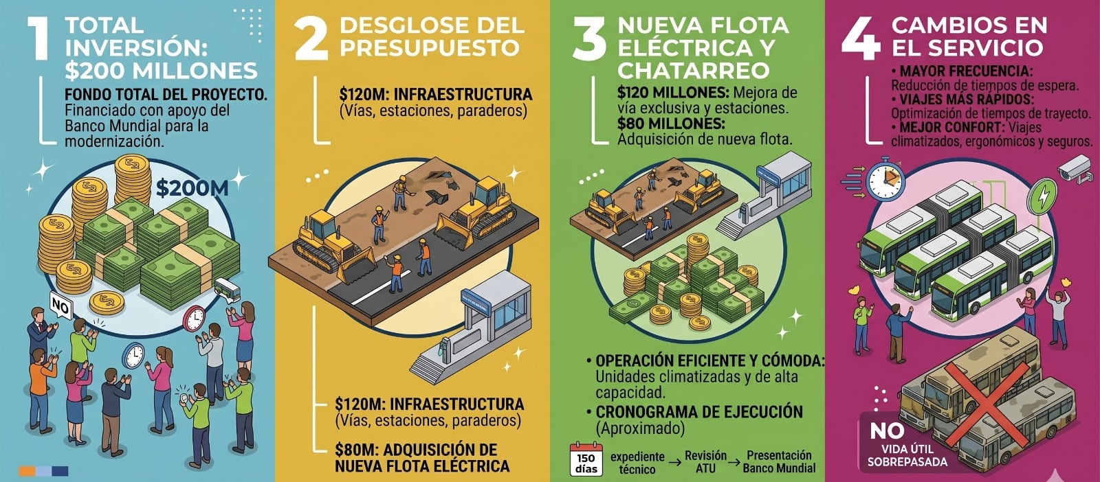 De los 200 millones de dólares previstos, 80 millones se destinarán específicamente a la compra de 60 buses con sistema eléctrico. Antes de concretar la adquisición, se establecerá un plazo de 150 días para la elaboración del expediente técnico, el cual será evaluado por personal de la ATU.