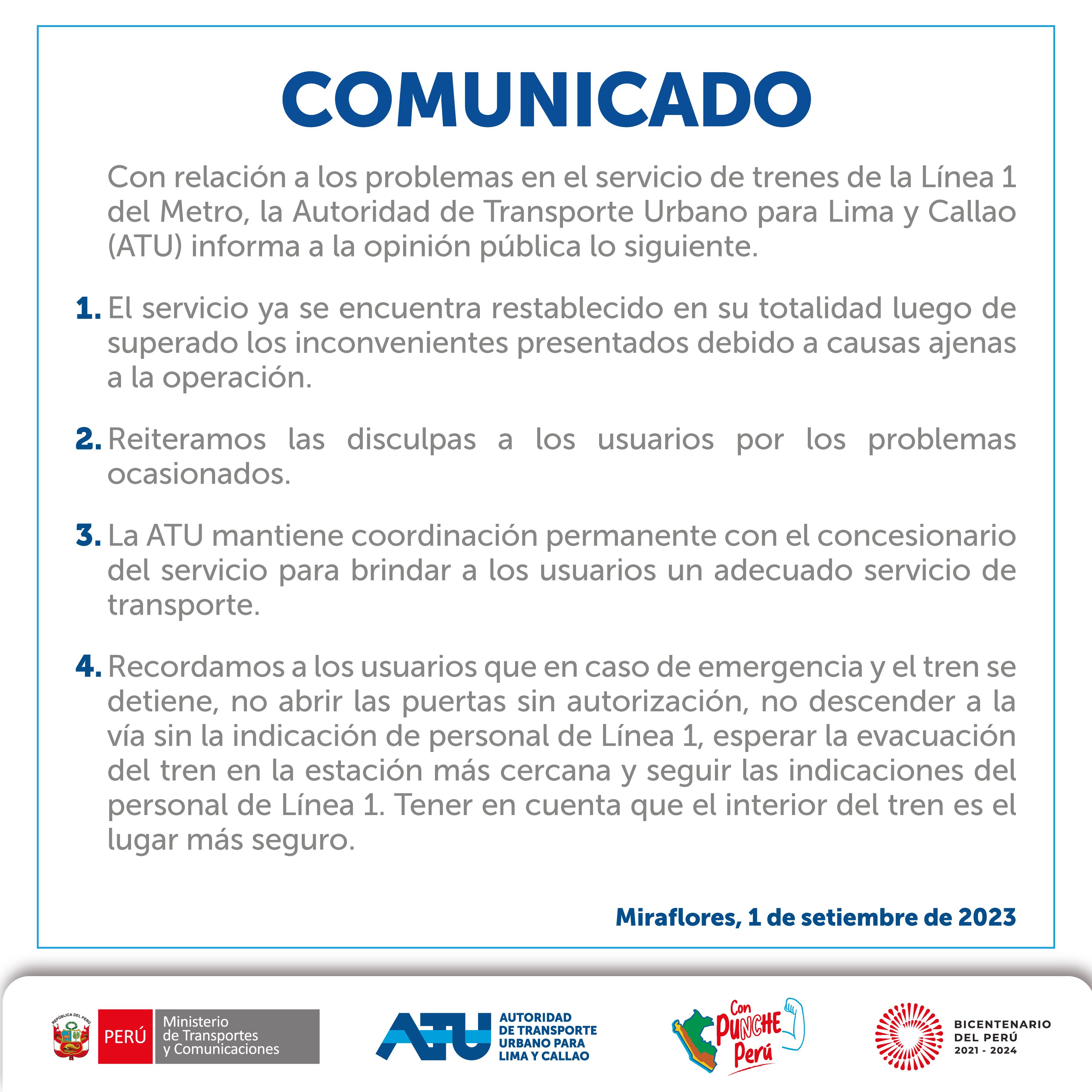 La Autoridad de Transporte Urbano para Lima y Callao (ATU) emitió un comunicado, donde anunció la reanudación del servicio de la Línea 1 del Metro de Lima, tras la aparición de problemas técnicos en algunas de sus estaciones.