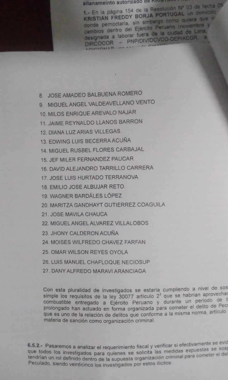 El fiscal recordó que en abril del año pasado se capturó a tres integrantes del Ejército, presuntos miembros de la mencionada organización criminal, y en mayo de este año, a seis. “A raíz de la primera intervención, se ha podido hilar en las investigaciones y se dio como resultado una medida de prisión preliminar contra las 27 personas, así como el allanamiento de sus inmuebles y también de las instalaciones de lo que es el Comando de Educación y Doctrina del Ejército”, manifestó el fiscal Tello.