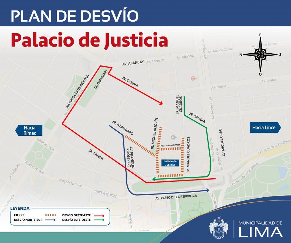 Este jueves 2 de enero se ejecutará un plan de desvío por la apertura del Año Judicial 2020 organizado por el Palacio Nacional de Justicia, en el Cercado de Lima, así lo informó la Municipalidad de Lima.
