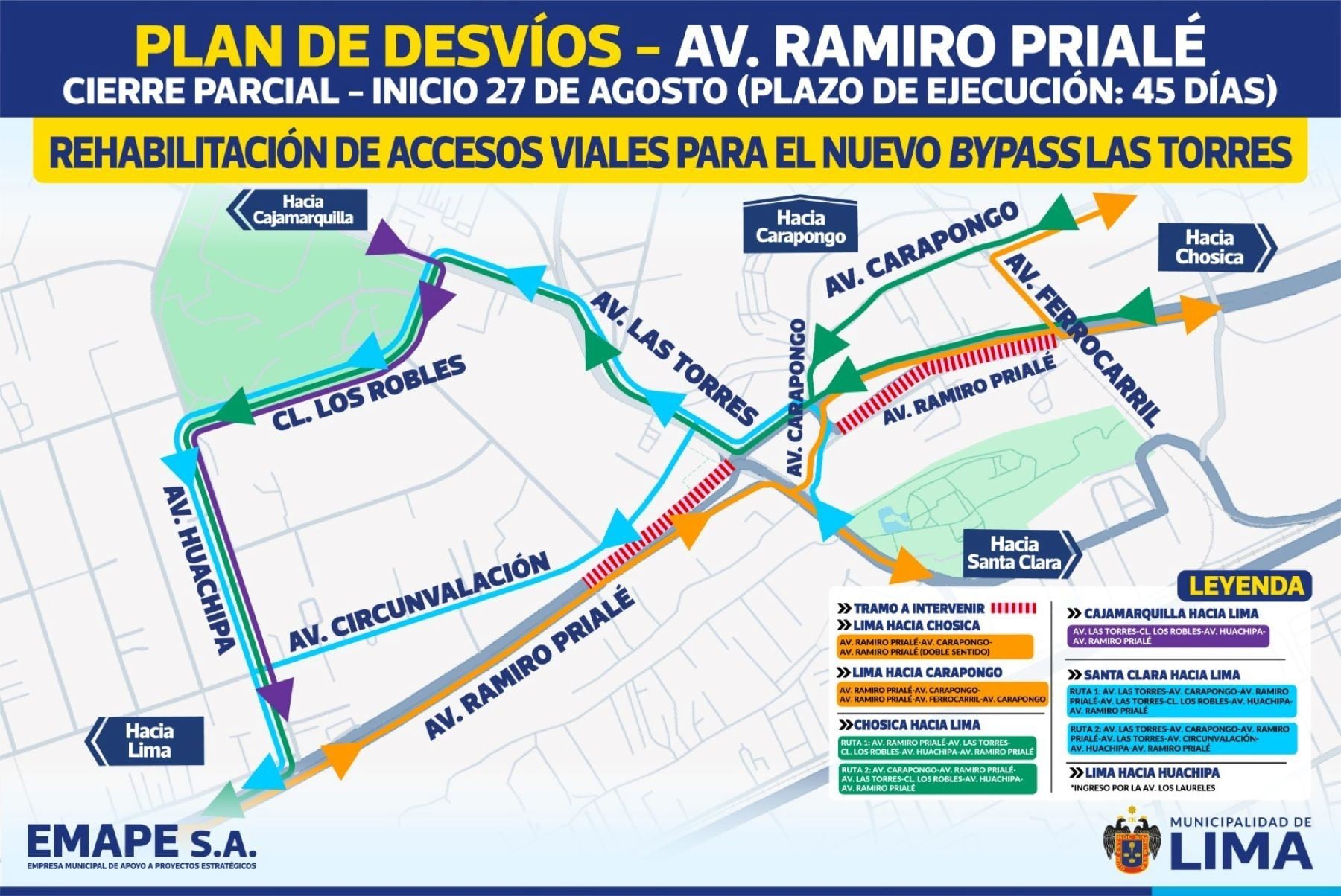 La Empresa Municipal Administradora de Peaje de Lima (Emape) informó que a partir del miércoles 27 de agosto se pondrá en marcha un plan de desvío vehicular en la avenida Ramiro Prialé, debido al inicio de trabajos de rehabilitación de pistas para la construcción del bypass Las Torres, una megaobra que busca agilizar el tránsito hacia Chosica y distritos aledaños.