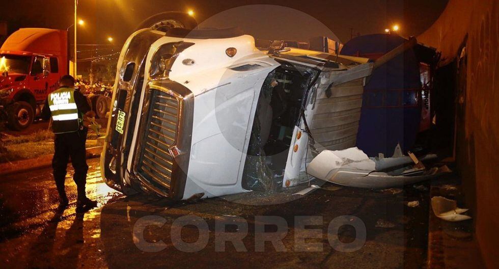 "Un tráiler cisterna de la municipalidad que se dedica al regado de jardines. Como consecuencia se ha echado sobre su lado izquierdo y uno de los trabajadores ha quedado comprimido contra la pared", expresó Ronald Saldaña, efectivo policial de la comisaría Bayóvar.