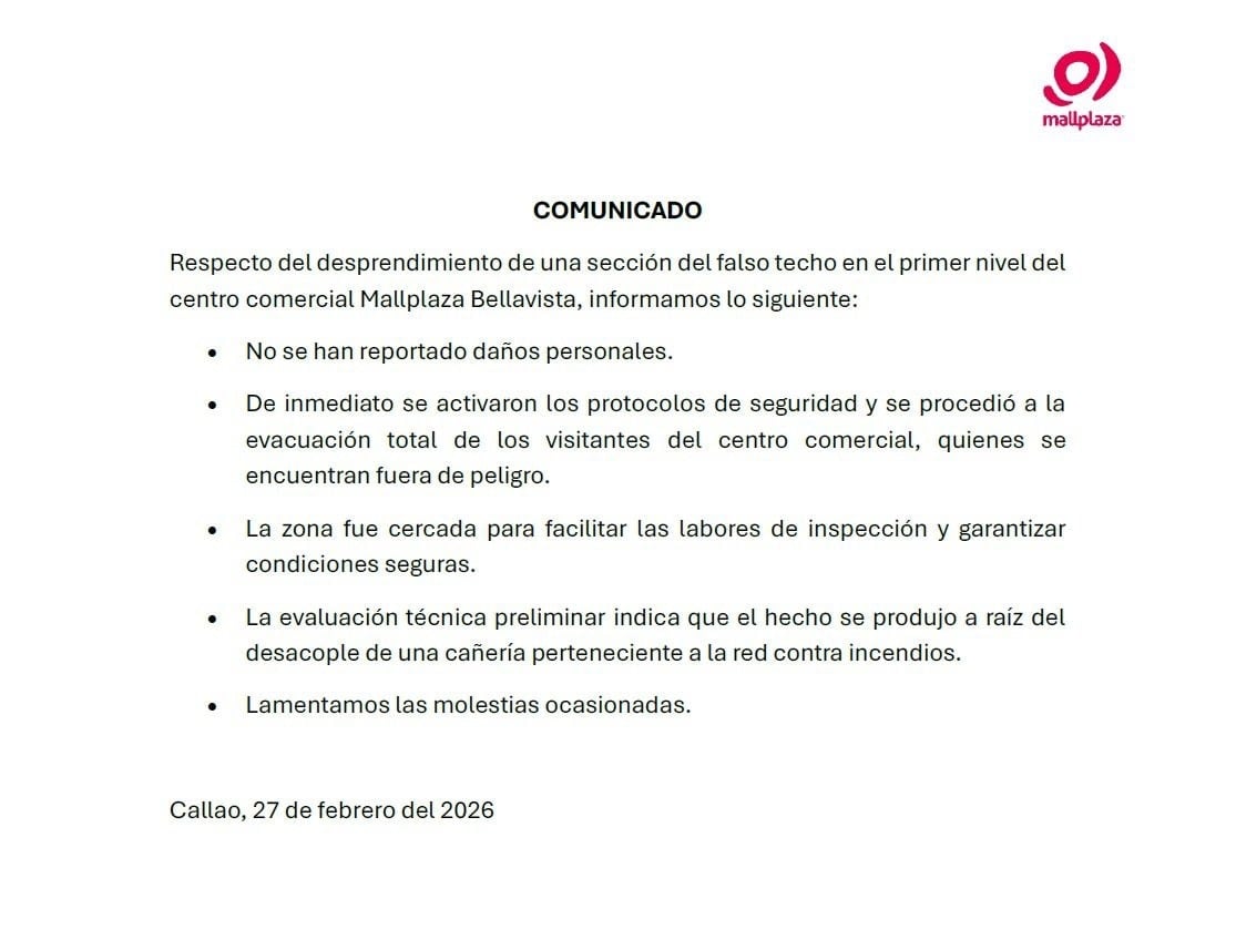 Este viernes, el centro comercial Mallplaza Bellavista, ubicado en el Callao, fue clausurado temporalmente luego de que parte de su falso techo colapsara por la falla en una tubería interna del local. El incidente obligó a evacuar a visitantes y trabajadores del recinto, aunque no se reportaron víctimas.