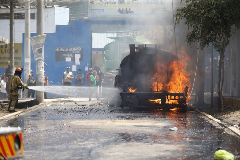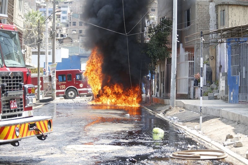 Un camión cisterna cargado con brea destinada a trabajos de asfaltado se incendió en la cuadra 1 del jirón Pedro Ruiz Gallo, en Collique Cuarta Zona, frente al colegio Coronel Gálvez, en el distrito de Comas.