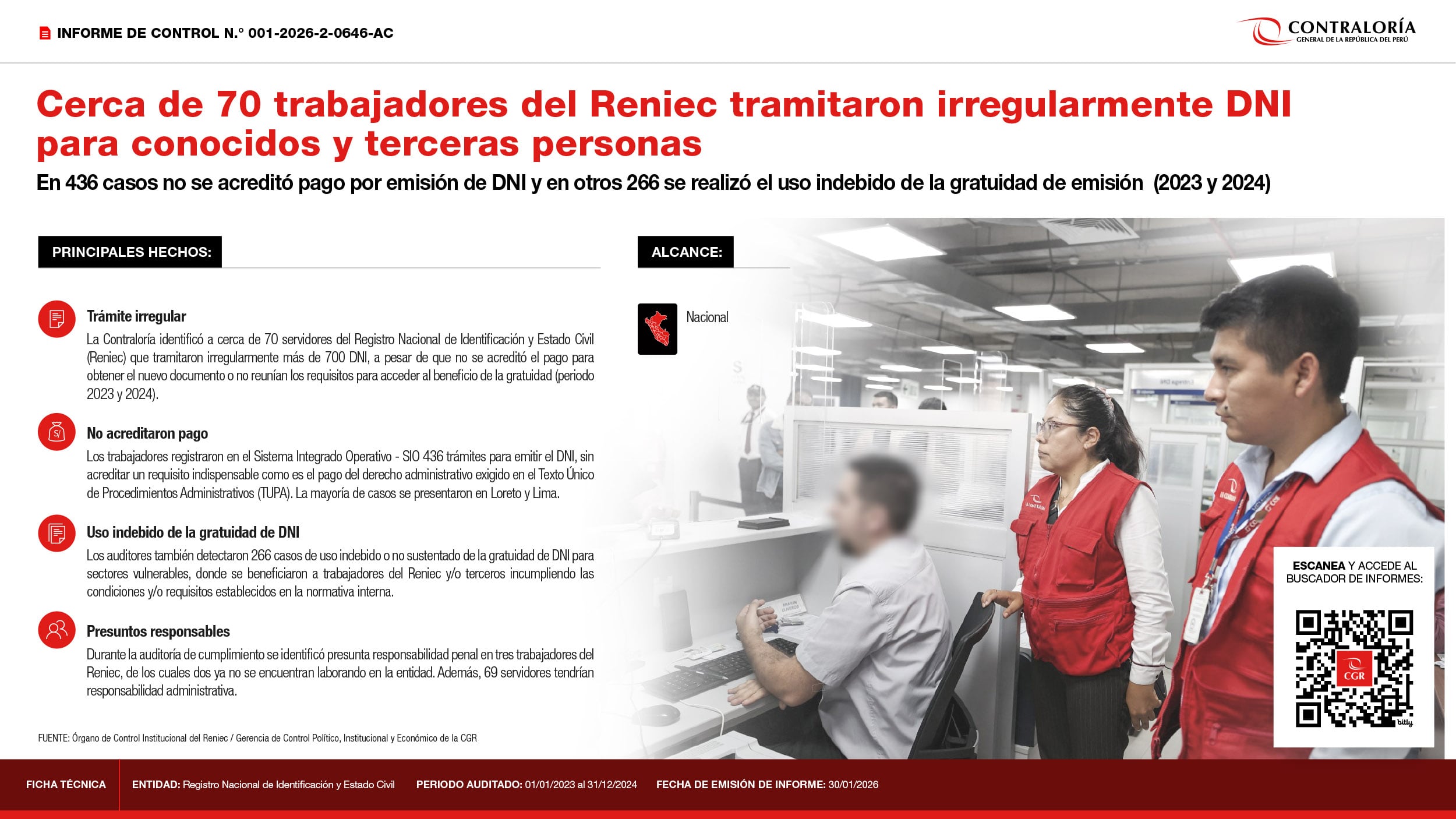 La Contraloría General de la República del Perú identificó que cerca de 70 trabajadores del Registro Nacional de Identificación y Estado Civil tramitaron de forma irregular más de 700 Documentos Nacionales de Identidad (DNI) durante los años 2023 y 2024.