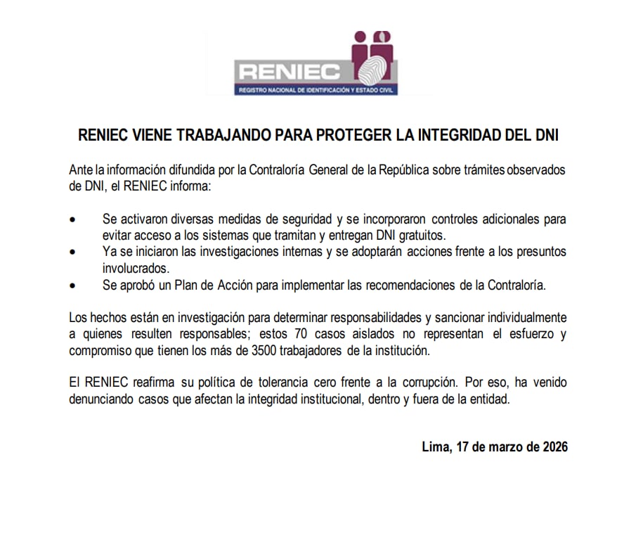 Asimismo, el RENIEC precisó que “los 70 casos aislados no representan el esfuerzo y compromiso que tienen los más de 3,500 trabajadores de la institución” y reafirmó “su política de tolerancia cero frente a la corrupción”.