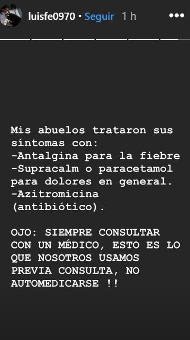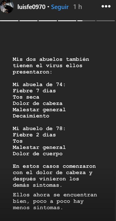 “Cuando empecé a sentir síntomas habiendo regresado de Europa preferí no ir a trabajar porque ya tenía en mente que podía ser este virus. Me quedé en casa y lamentablemente se contagiaron 7 de mis familiares. Desde que supe mi resultado, tomamos todas las medidas para que el resto de personas que viven en mi casa no se contagien”, contó el joven en otro de sus stories.