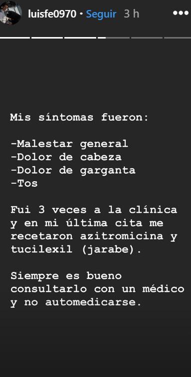 “Mis síntomas fueron: malestar general, dolor de cabeza, dolor de garganta, tos. Fui 3 veces a la clínica y en mi última cita me recetaron azitromicina y tucilexil (jarabe). Siempre es bueno consultarlo con un médico y no automedicarse”, agregó en otra de sus publicaciones.