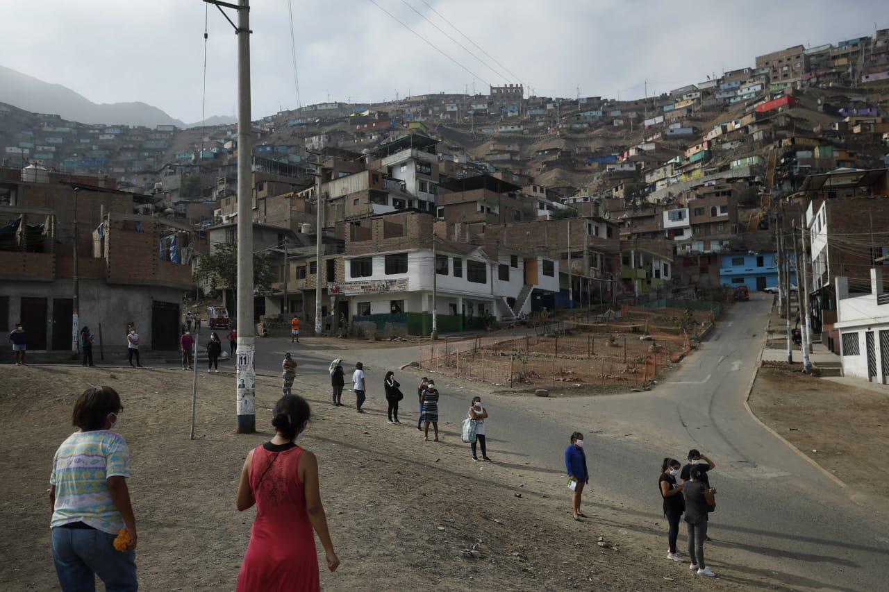 Asimismo, en el mercado implementado por el Ministerio de Agricultura en la Balanza, en Comas, mujeres respetan la distancia de un metro en las colas que realizan para comprar productos de primera necesidad.