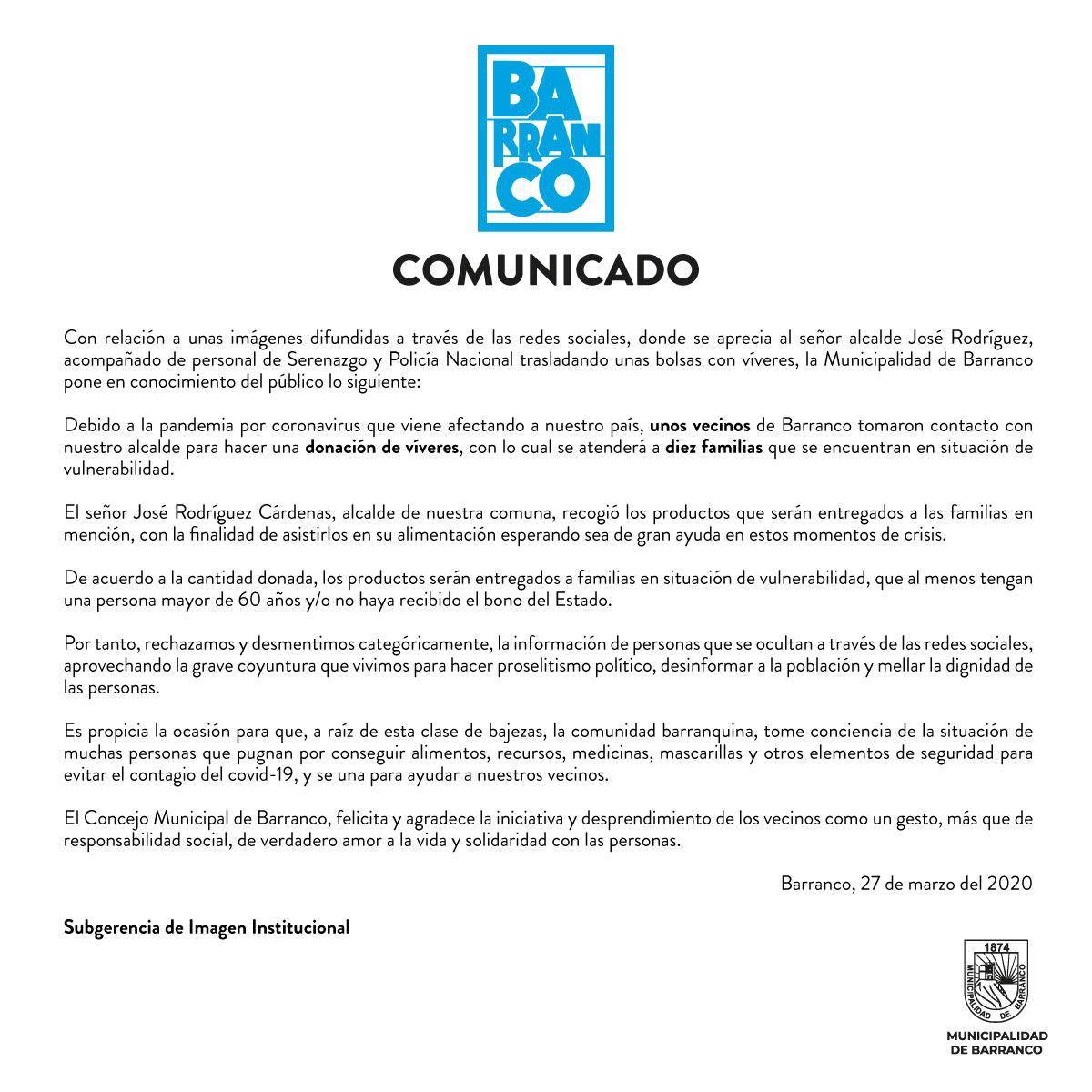 José Rodríguez, alcalde de Barranco, dijo que llevó donaciones para personas que más lo necesitan hasta su casa porque en la municipalidad no había ninguna persona.