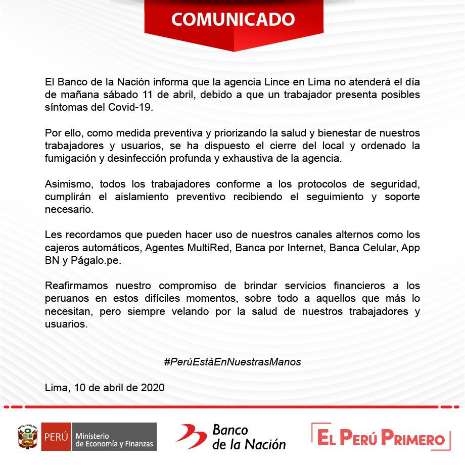 “Reafirmamos nuestro compromiso de brindar servicios financieros a los peruanos en estos difíciles momentos, sobre todo a aquellos que más lo necesitan, pero siempre velando por la salud de nuestros trabajadores y usuarios", se lee al final del comunicado.