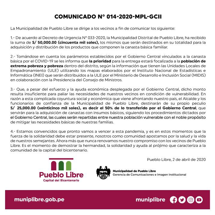 “La Municipalidad distrital de Pueblo Libre ha recibido la suma de 50 mil soles, los mismos que serán destinados en su totalidad para la adquisición y distribución de los productos que componen la canasta básica familiar”, sostuvo en un comunicado dirigido a sus vecinos.