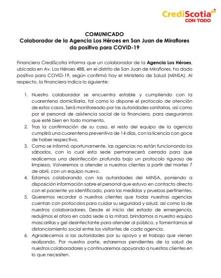 CrediScotia informó, mediante un comunicado, que uno de sus trabajadores de la agencia Los Héroes, ubicada en la avenida Los Héroes 488, en el distrito de San Juan de Miraflores, dio positivo por el nuevo coronavirus, COVID-19.