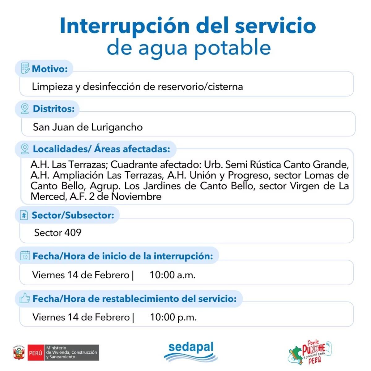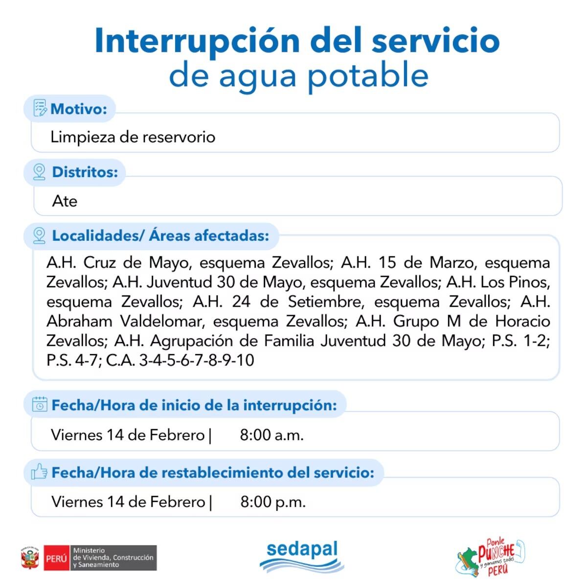 Los distritos afectados por esta interrupción son Ate, San Juan de Lurigancho, San Martín de Porres y Lurigancho.