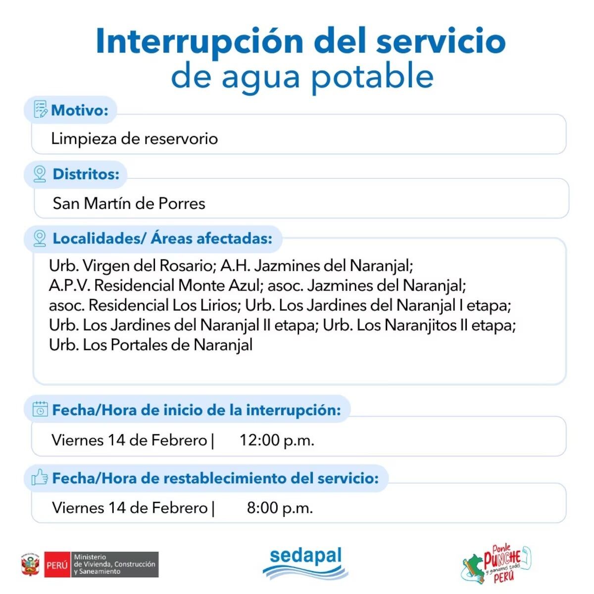 Sedapal recomienda a los vecinos de estos distritos tomar las precauciones necesarias y almacenar agua con anticipación, pues el corte se producirá a lo largo del día. Al concluir los trabajos de mantenimiento, el suministro se restablecerá de manera progresiva.