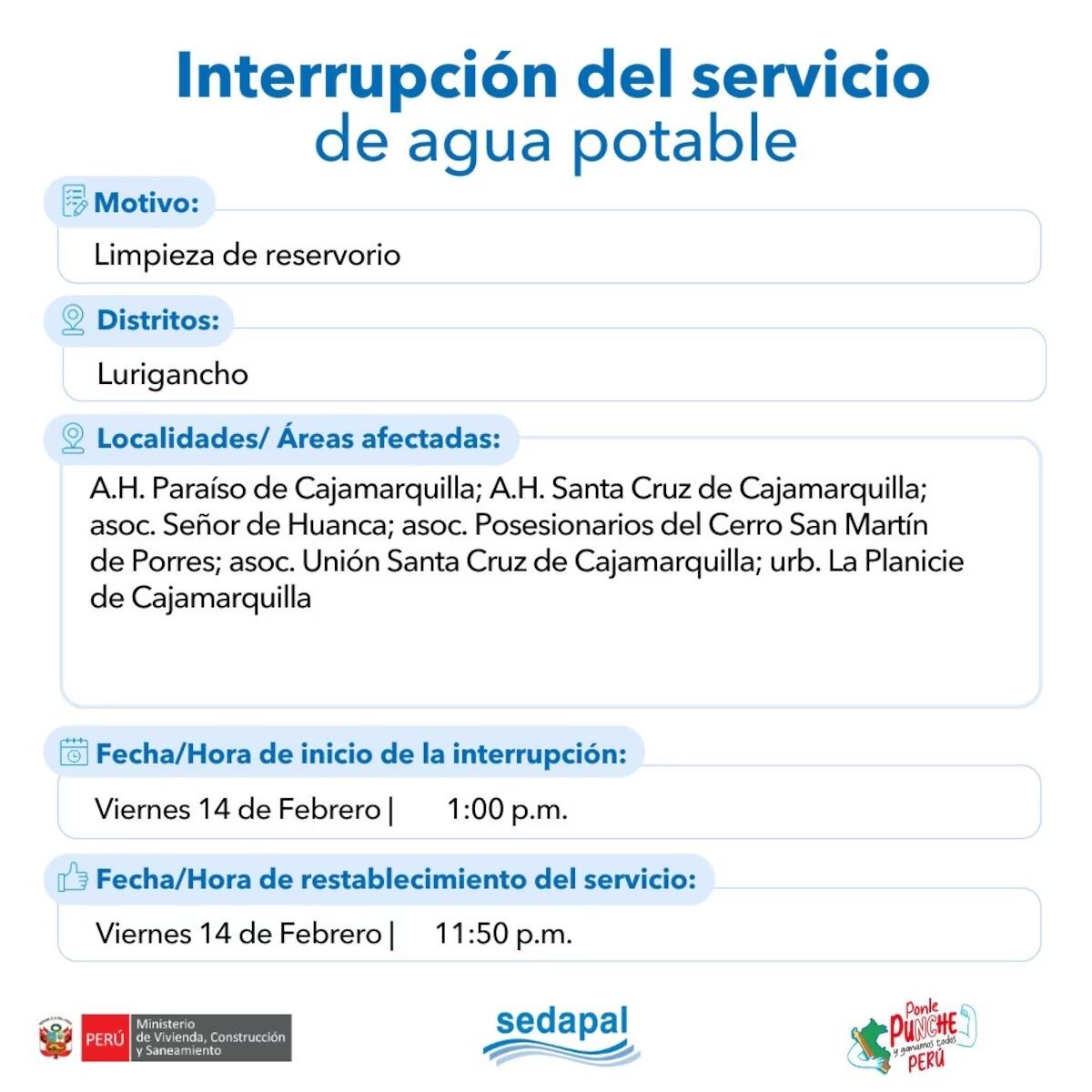 El Servicio de Agua Potable y Alcantarillado de Lima (Sedapal) anunció que este 14 de febrero, fecha en la que se celebra el Día de San Valentín, suspenderá el servicio de agua potable en cuatro distritos de Lima.