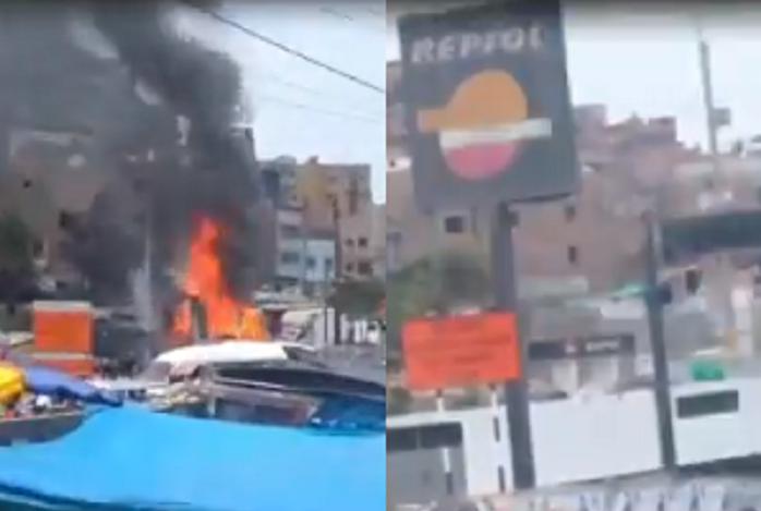 Un incendio se viene registrando en el cruce de las avenidas 28 de Julio y Nicolás Ayllón, en el límite del Cercado de Lima y El Agustino, cerca de un grifo.