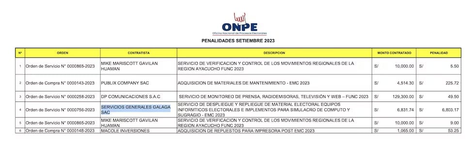 | Septiembre 2023 | Incumplimiento en despliegue de material para comicios municipales complementarios | S/ 6,803.17 |