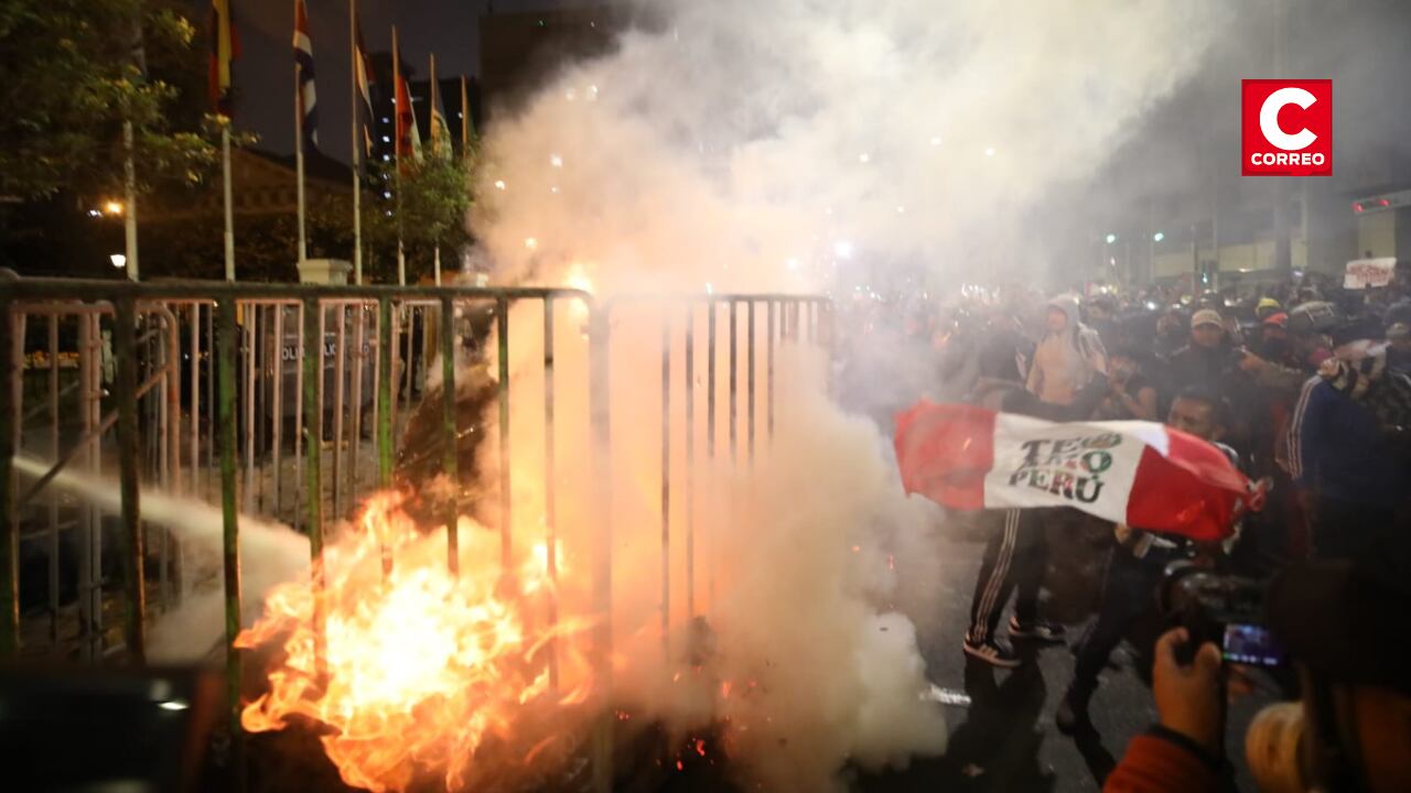 El lugar se observa fuego, ante ello la PNP hace uso de bombas lacrimógenas. Los manifestantes denuncian que personas infiltradas atentan contra la naturaleza pacífica de la marcha de este 15 de octubre, lanzando piedras y prendiendo fuego.