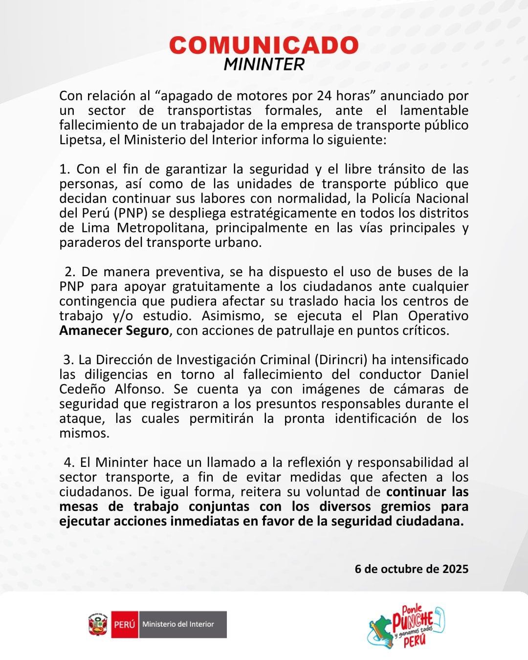 El Ministerio del Interior informó, a través de un comunicado, que la Policía Nacional se encuentra desplegada estratégicamente en todos los distritos de Lima Metropolitana con el fin de garantizar la seguridad y el libre tránsito de las personas.