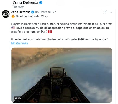 “Desde adentro del Viper (...) En este reel, nos metemos dentro de la cabina del F-16 junto al legendario F-16 Viper Demo Team, capturando cada maniobra, cada G y la precisión que define a uno de los cazas más icónicos del mundo”, se lee en la cuenta de Zona Defensa en “X”.
