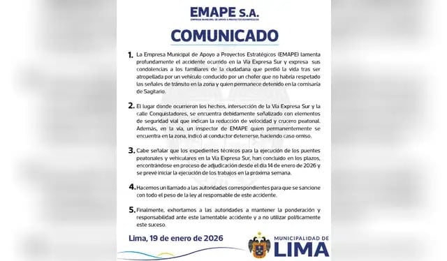 Horas después del fallecimiento, la Autoridad de Transporte Urbano para Lima y Callao emitió un comunicado presentando sus descargos. Según la entidad adscrita al MTC, el paso peatonal está debidamente señalizado, aunque en las imágenes del lugar no se logra observar claramente dicha señalización.