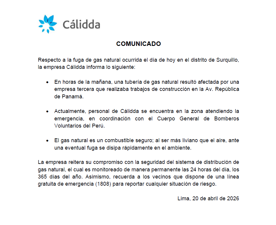 En horas de la mañana de hoy, una fuga de gas natural movilizó a los vecinos y autoridades en la cuadra 51 de la avenida República de Panamá, en el distrito de Surquillo. Según el comunicado oficial de Cálidda, la emergencia se originó cuando una empresa tercera que realizaba trabajos de construcción afectó accidentalmente una tubería de gas natural.