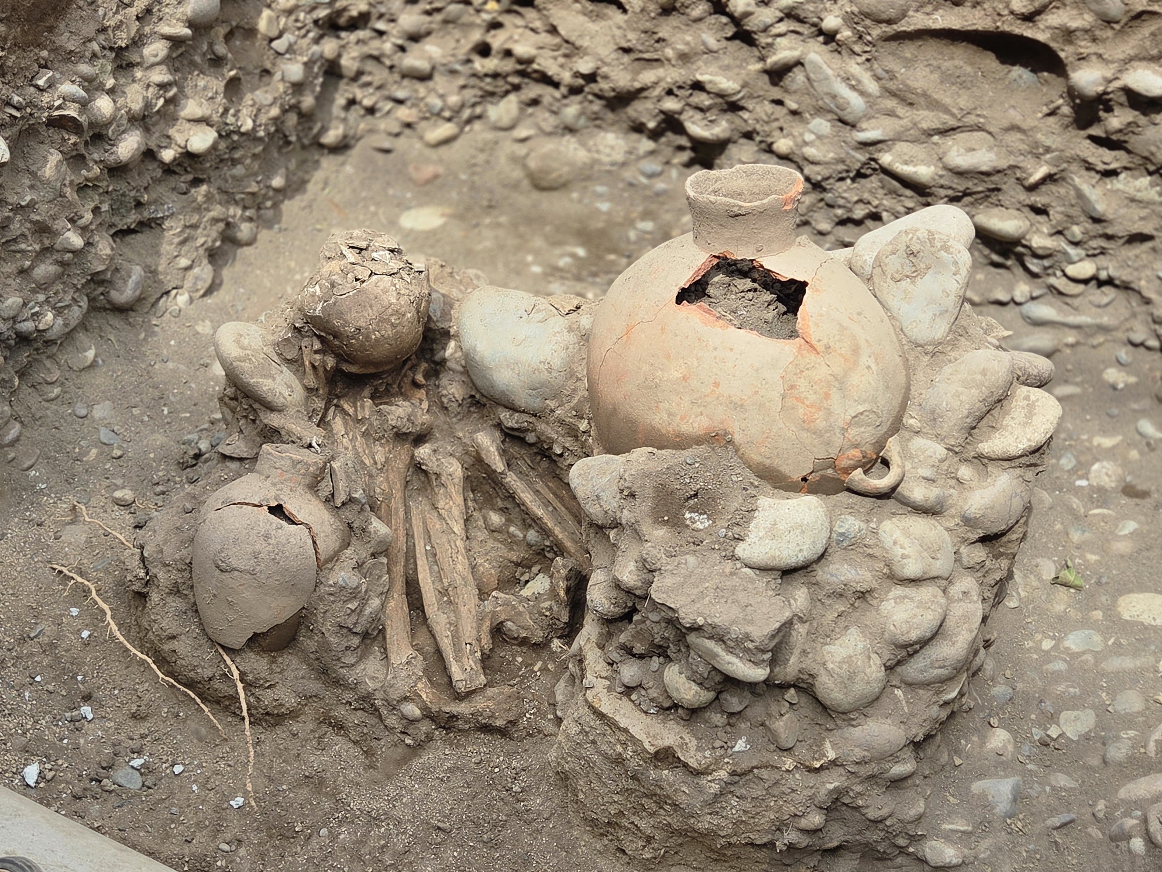 El cuerpo fue protegido con cantos rodados que formaban una estructura funeraria sobre la cual se colocaron tres vasijas de cerámica.