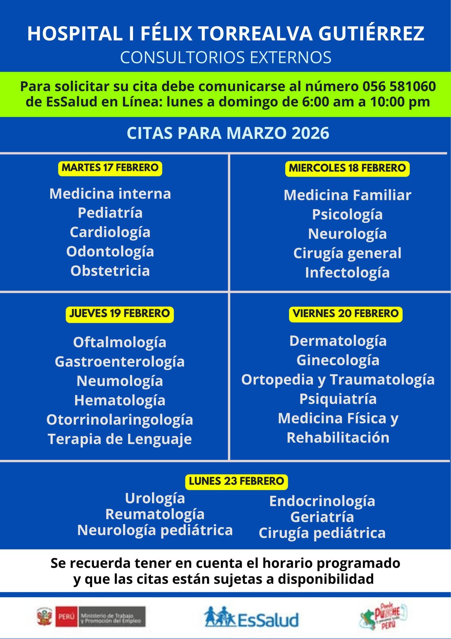 La programación de citas por especialidad será la siguiente: el martes 17 de febrero se atenderá medicina interna, pediatría, cardiología, odontología y obstetricia; el miércoles 18 de febrero medicina familiar, psicología, neurología, cirugía general e infectología; el jueves 19 de febrero oftalmología, gastroenterología, neumología, hematología, otorrinolaringología y terapia del lenguaje.