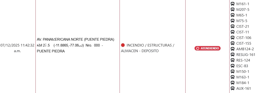 El incendio se reporta en un punto registrado en el jirón Los Ficus, a la altura del kilómetro 25 de la avenida Panamericana Norte, en Puente Piedra. Se trata de una zona industrial y comercial donde operan almacenes y depósitos.