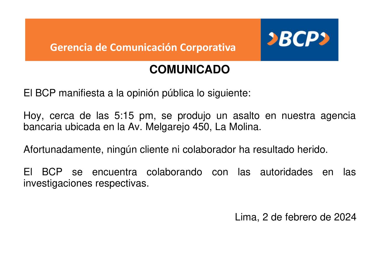 La gerencia de comunicación corporativa del Banco de Crédito del Perú publicó un pronunciamiento y brindó detalles del asalto a una de sus principales agencias bancarias.