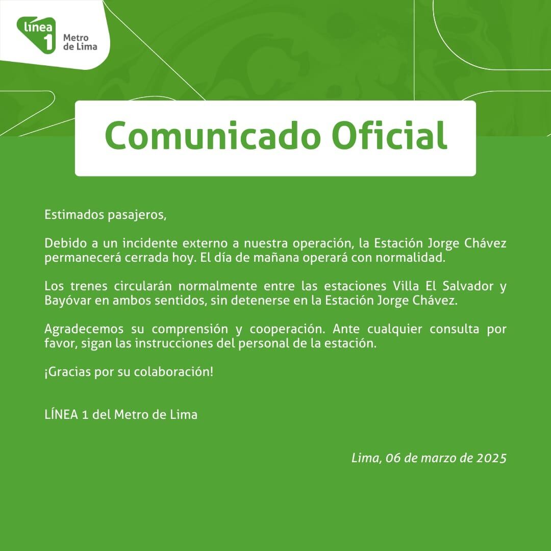 Comunicado de Línea 1 sobre el cierre de la Estación Jorge Chávez