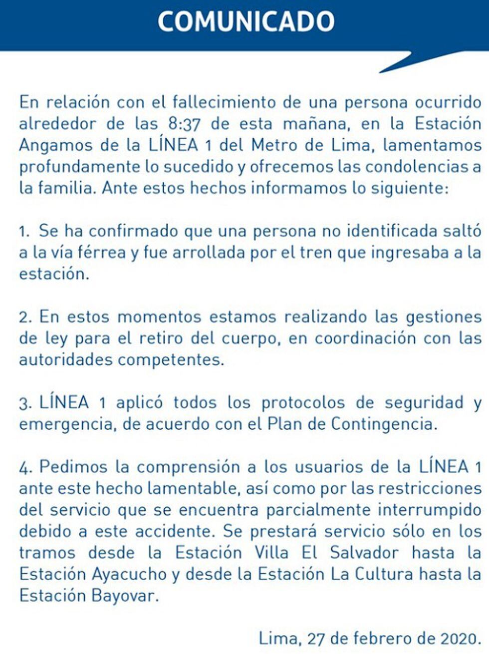 A través de una publicación compartida en redes sociales detalla que se prestará el servicio solo en los tramos desde la estación Villa El Salvador hasta la estación Ayacucho y desde la estación La Cultura hasta la estación Bayóvar.