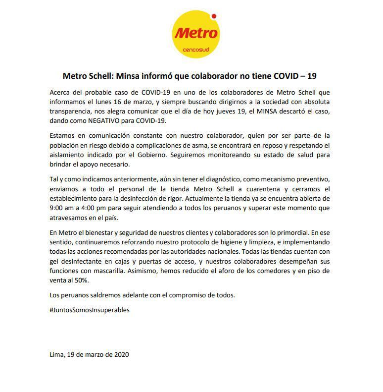 Como se recuerda, el pasado lunes 16 de marzo, Metro dio a conocer que uno de sus empleados del local de Schell fue diagnosticado como un probable caso de coronavirus, por lo que de inmediato activaron mecanismos preventivos como enviar al resto del personal a cuarenta y esterilizar la tienda.