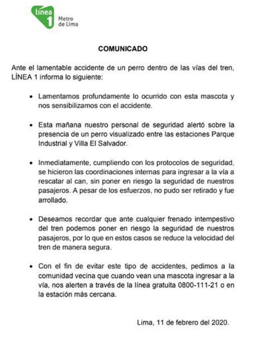 “Averiguando un poco más, con varios trabajadores, nos enteramos que este no sería un caso aislado, sino que ya se han dado varios similares de animales que ingresan por accidente a la vía de la Línea 1 y no son auxiliados dejándolos morir de hambre o atropellados, algo que una parte del mismo personal rechaza”, se lee en la publicación difundida en Facebook.