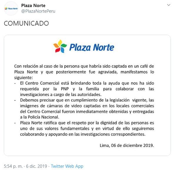 A través de un comunicado en su cuenta de Twitter, Plaza Norte indicó que está colaborando con la investigación requerida por la Policía Nacional del Perú (PNP) y por los familiares de la víctima.