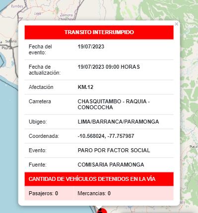 El mapa interactivo de la Superintendencia de Transporte Terrestre de Personas, Carga y Mercancías (Sutran) reportó este miércoles 19 de julio un bloqueo en la carretera Chasquitambo - Raquia- Conocha, en dirección a Barranca.