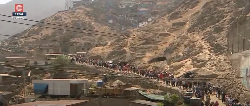América TV registró en vivo una fila que superaba las quinientas personas a simple vista, extendiéndose desde la parte alta del cerro hasta su base. Los electores permanecieron en esa condición desde las ocho de la mañana, hora oficial de inicio de la votación, sin recibir información sobre cuándo se abriría el acceso al local.