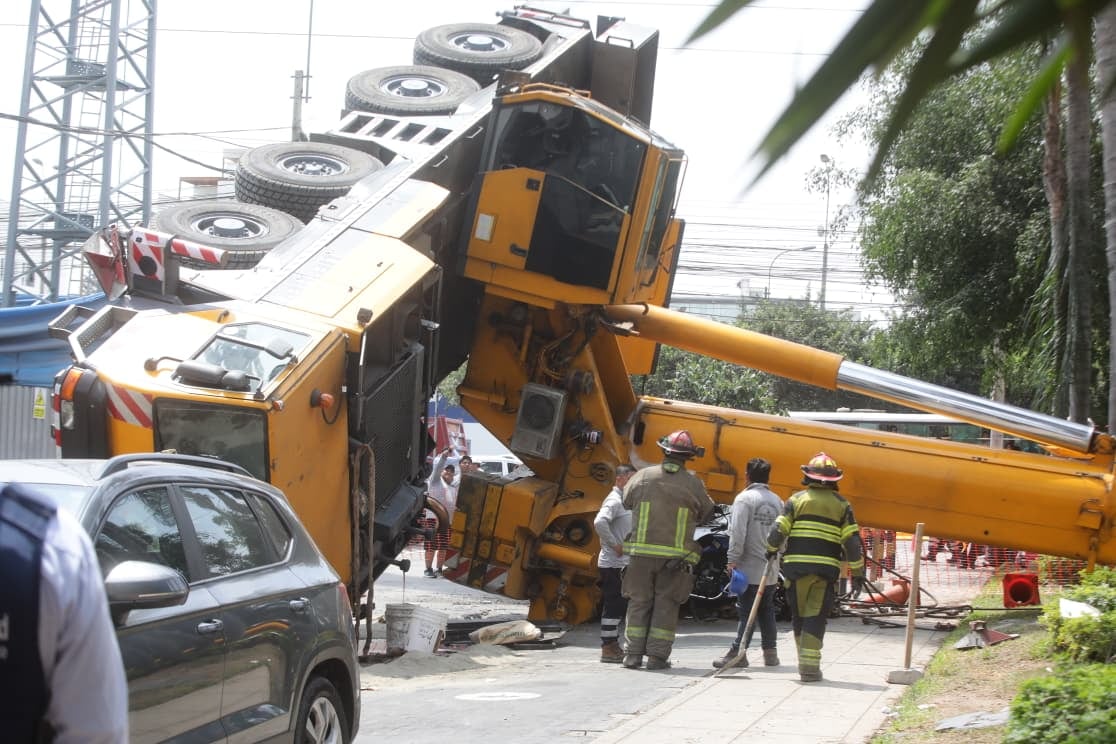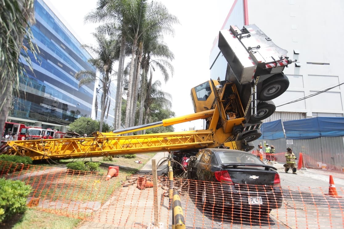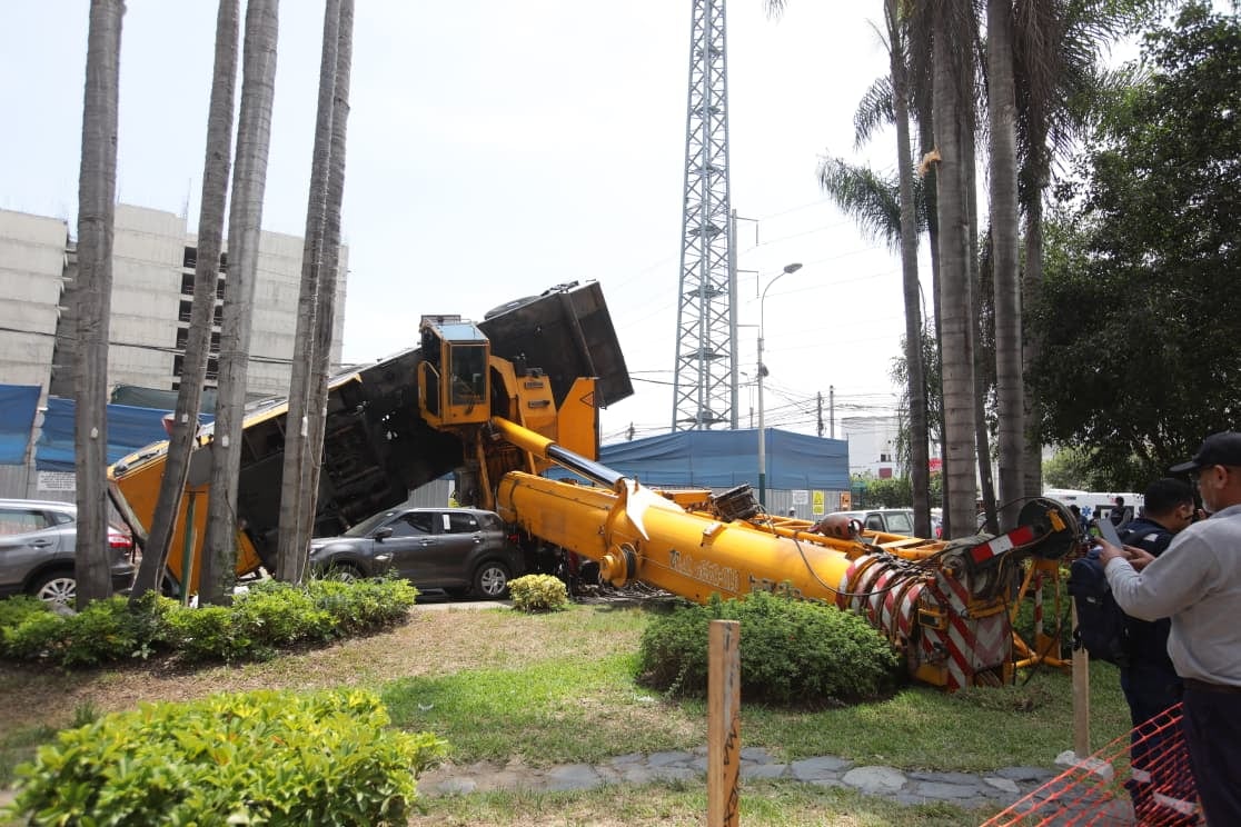 Una enorme grúa pluma se volcó y cayó sobre dos automóviles y una motocicleta en la primera cuadra de la avenida Del Pinar, en el distrito de Santiago de Surco.