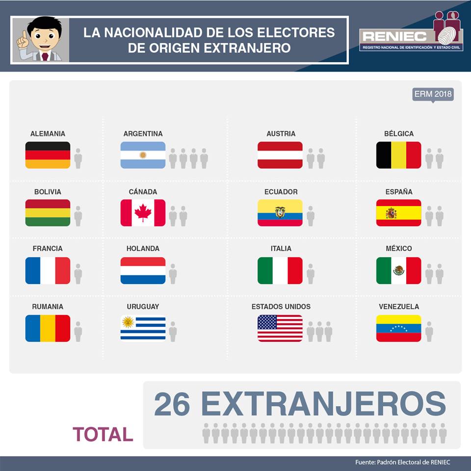 De acuerdo a lo expresado por el ente registral, el próximo 7 de octubre "solo 26 extranjeros mayores de 18 años y con 2 años de residencia continua en nuestro país, podrán votar en las Elecciones Regionales y Municipales".