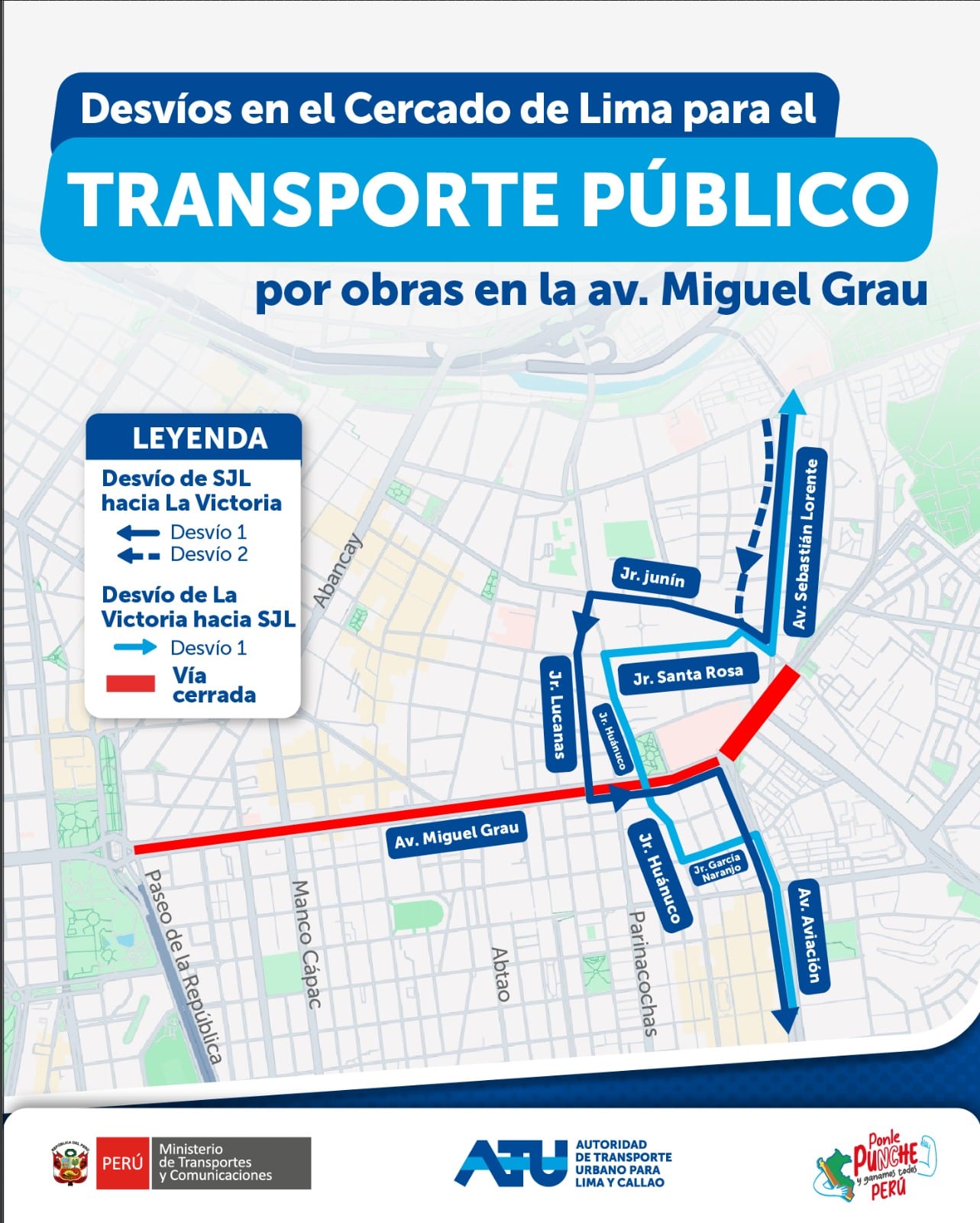 - De San Juan de Lurigancho hacia La Victoria: el tránsito irá por av. Sebastián Lorente, jirones Junín y Lucanas, av. Miguel Grau y av. Aviación para luego retomar su recorrido. En el sentido contrario, circularán por av. Aviación, jr. Huánuco, jr. Santa Rosa, jr. Junín y av. Sebastián Lorente.