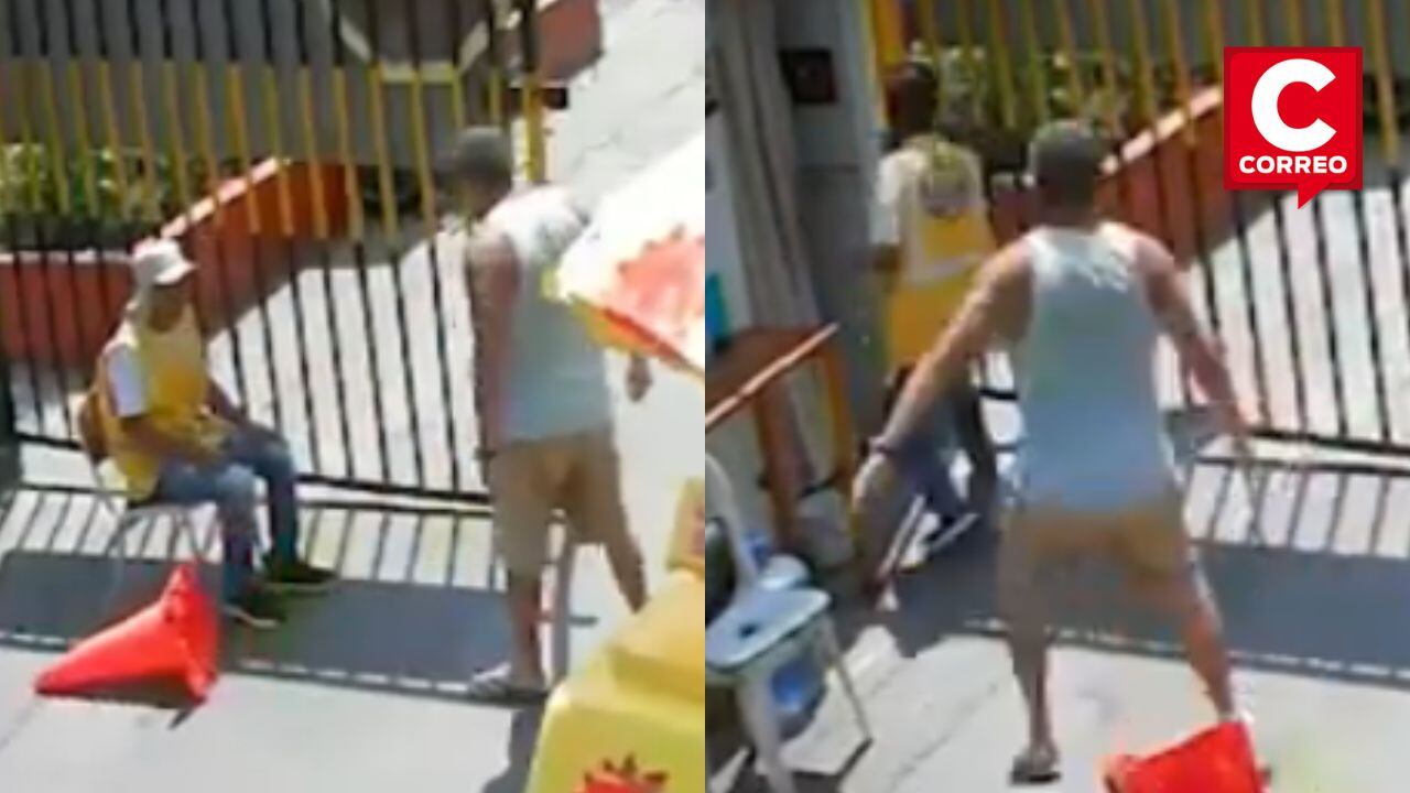 En las imágenes se observa al agresor acercarse al vigilante, quien se encontraba sentado en su puesto de trabajo. El hombre, sin mediar palabra, lanza un cono de seguridad hacia el trabajador. La víctima, en un acto de defensa, le devuelve el cono, lo que desata la furia del agresor.