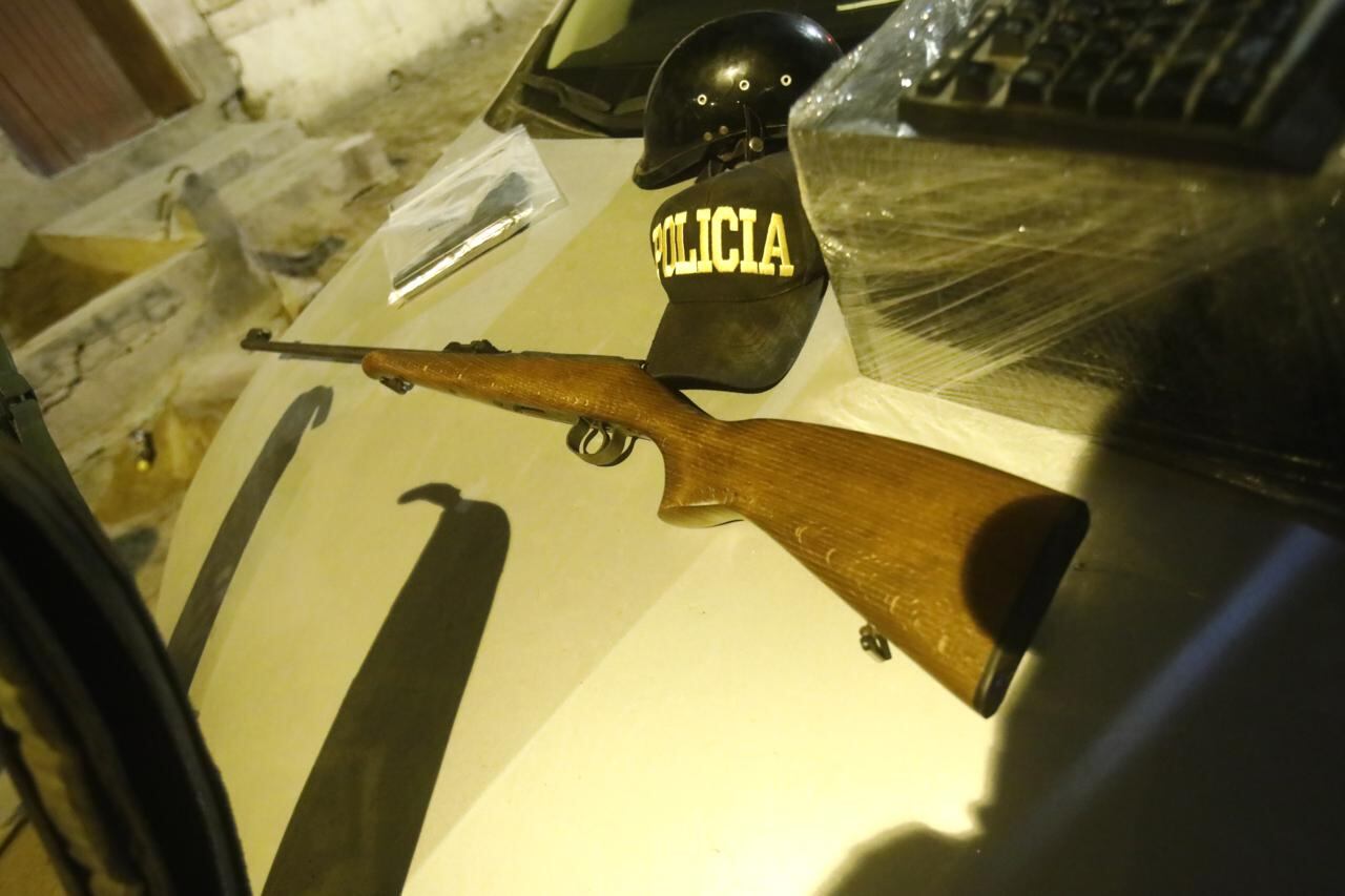 El coronel Montúfar precisó que, durante la intervención, se hallaron cuatro cartuchos de dinamita, una granada de guerra, una carabina, una pistola de aire comprimido, teléfonos celulares, municiones, sobres con mensajes extorsivos y una gorra con insignias policiales.