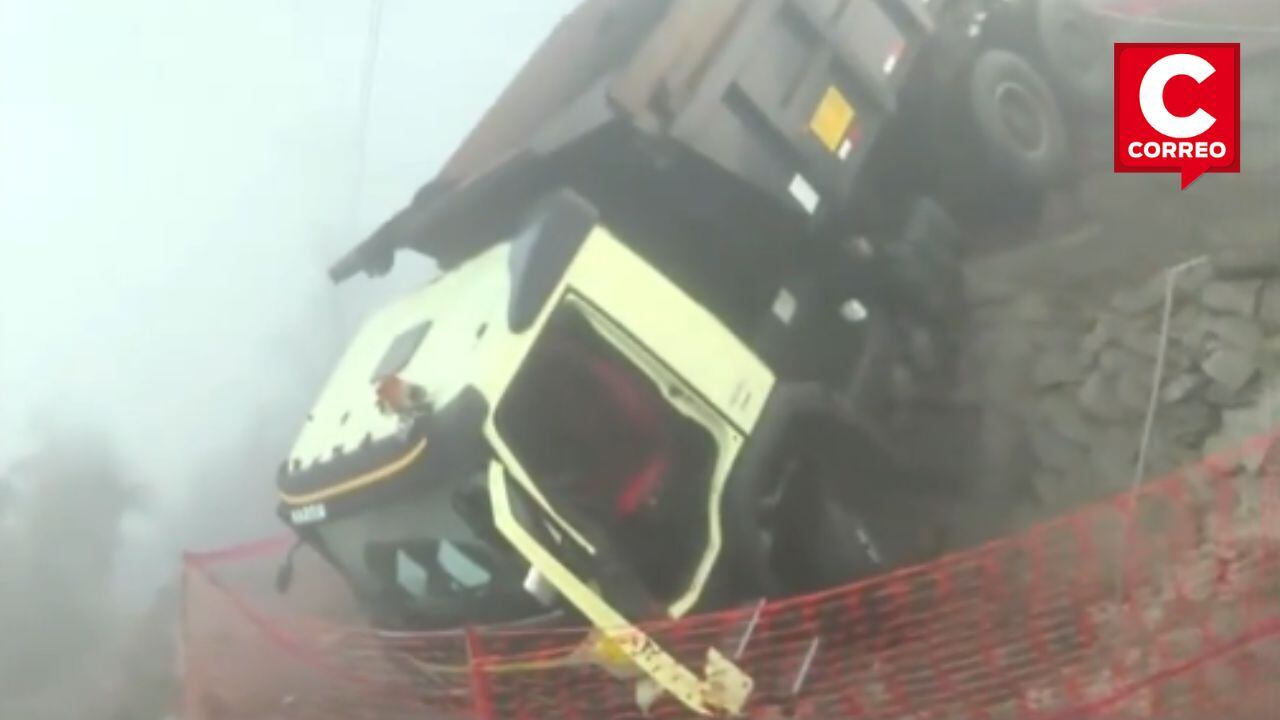 Un volquete se volcó mientras descargaba arena en la zona, quedando peligrosamente al borde de un abismo con riesgo de caer sobre las viviendas en el asentamiento humano Villa de Lourdes II Ecológico, en Villa María del Triunfo.
