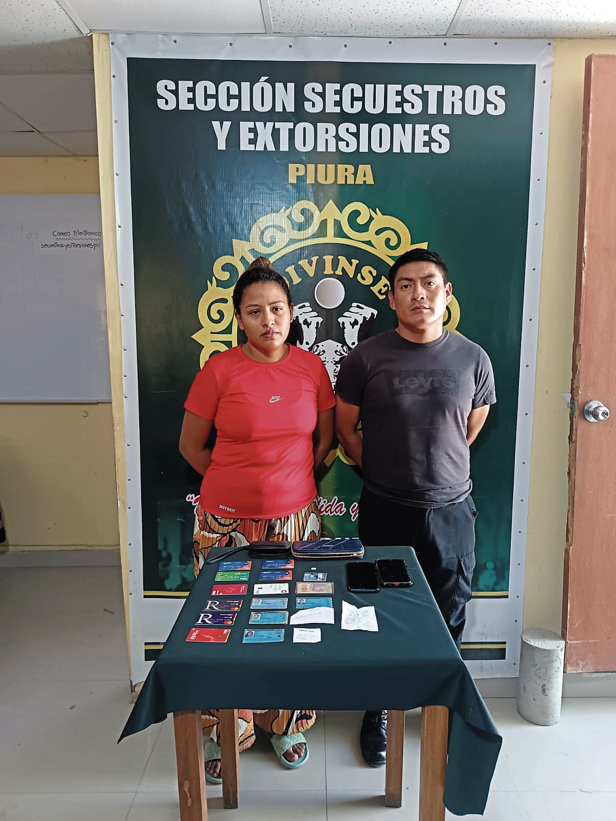 La detención ocurrió cuando los efectivos policiales del área de extorsiones y secuestros de la Divincri acudieron a la comisaría de Veintiséis de Octubre donde laboraba el intervenido. Ahí lograron detener al suboficial de segunda Wilmer Monsefú Mendoza, de 32 años. En paralelo, capturaron a su pareja, Ruth Kiara Cruz Chorres, en otro sector de la ciudad.