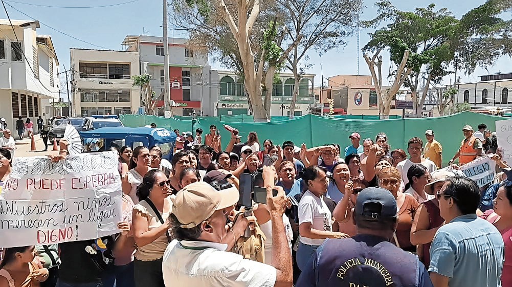 Decenas de padres de familia protestaron al exterior de la Municipalidad Provincial de Paita para exigir al alcalde culminar la reconstrucción del colegio Nº 14741 Señor de los Milagros, ubicado en la parte baja de la provincia paiteña.