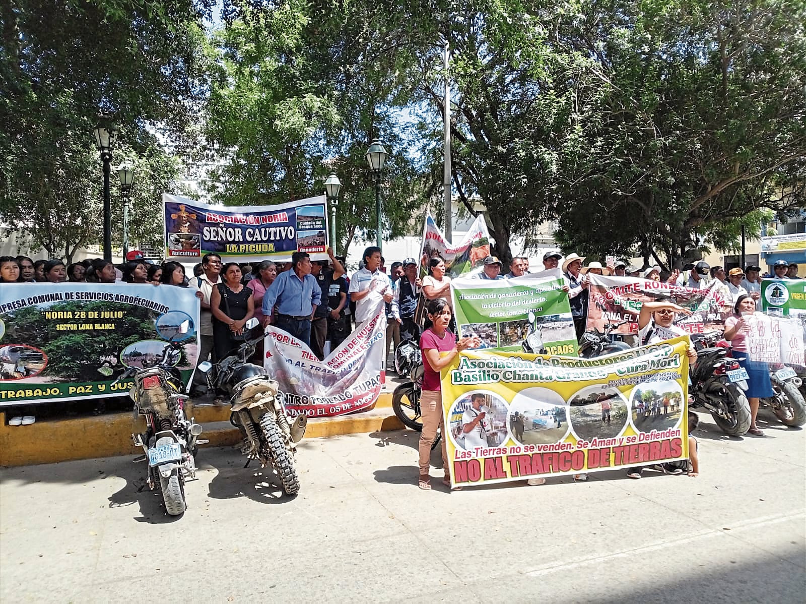 Los integrantes de la Comunidad Campesina San Juan Bautista de Catacaos realizaron una bulliciosa protesta en el exterior del Poder Judicial de Piura para exigir la devolución de sus cerca de 10 mil hectáreas que les fueron despojados por diversas empresas y entidades privadas.
