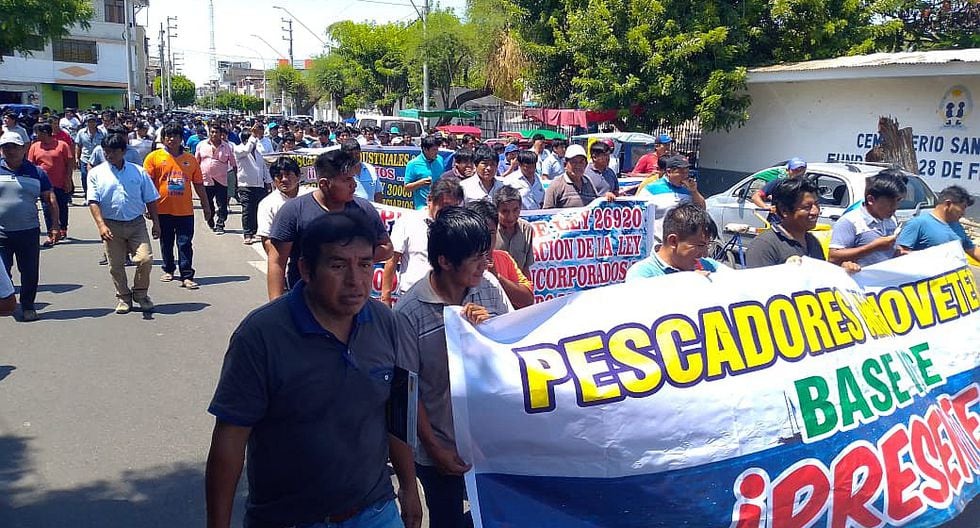 Un aproximado de 2,000 pescadores anchoveteros y armadores de la bahía de Sechura, con pancartas en mano, marchan por la principales calles del centro de Piura. Esto tras considerar inconstitucional la reestructuración del Instituto del Mar Peruano (Imarpe).