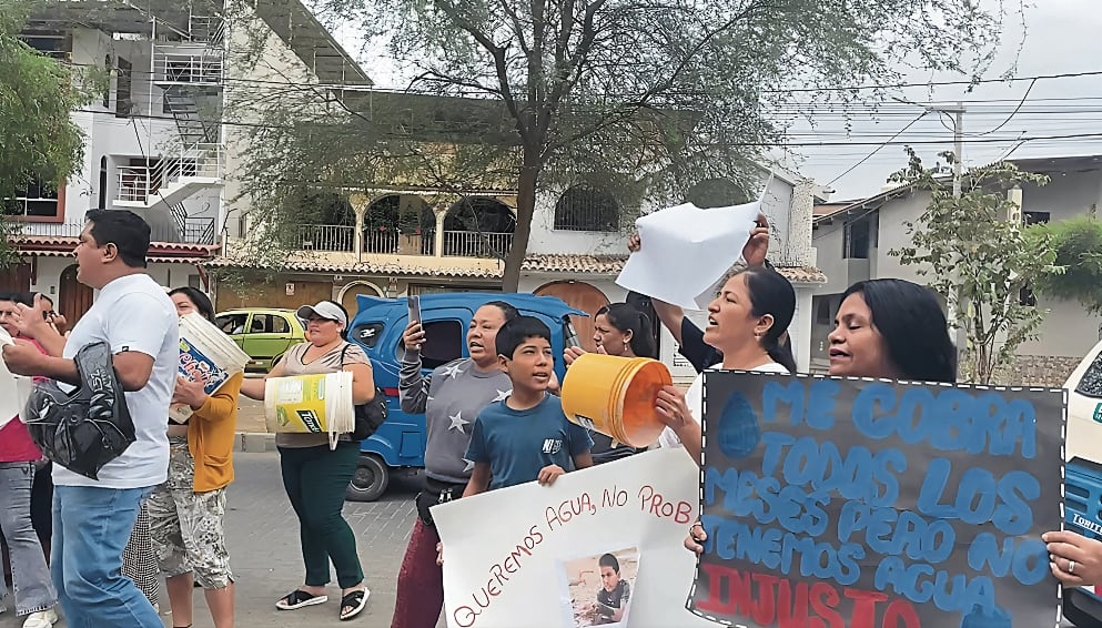 “Mónica Zapata no tiene agua, queremos agua ya”, “Queremos agua, no problemas” y “Me cobran todos los meses, pero no tenemos agua”, se leía en las pancartas que portaban los vecinos, quienes a viva voz exigieron la intervención inmediata de los funcionarios de la EPS Grau para que se brinde una solución concreta y se ejecute una obra que ponga fin a esta problemática.